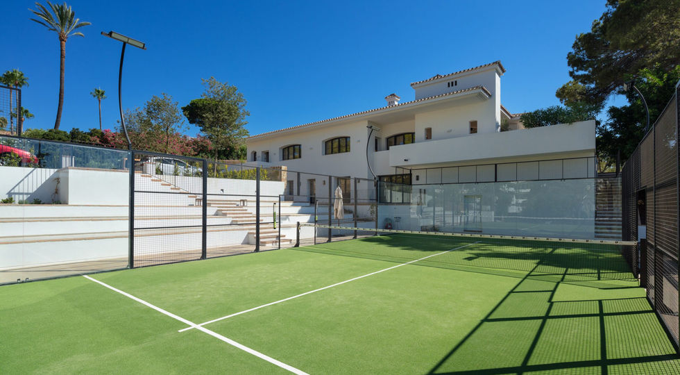 The ultimate unification of art, architecture and engineering under one roof. The most exquisitely conceived estate with breathtaking and unencumbered panoramic views towards the Mediterranean Sea and the spectacular backdrop of the Sierra Blanca mountain range, built on an ample plot of 8.799m2 and impressive built of 2.001m2. This authentic Spanish estate is located in one of the most sought after areas in the Golden Mile and has been crafted with bespoke finishes throughout. Designed by respected Spanish interior designer Luisa Olazábal, the property promotes an eclectic and timeless style, each corner of the premise being thoughtfully curated. This truly impressive villa opens up to a stunning grand salon with multiple lounge spaces built within a sunken area, each section staying true to its eccentric style, with an impressionable brass centre chandelier. You can also find a separate dining area with opposing dual open steal fireplaces with wooden clades. A surprise element hides just behind the velveted curtains, where you can find a fully customised cocktail bar with incorporated Bose speakers, personalised lighting elements, multiple chill-out areas, art-deco flooring and even a smoke machine. The wide-ranging indoors lead seamlessly to the magnificent backyard, connected by five large steal case French doors. The exquisite kitchen features a separate butler’s pantry and chef’s island, a stunning vintage Lacanche gas stove, built-in wooden cabinets for storage, wine cooler and walk-in fridge. The bright dining area overlooks the panoramic garden and sea views and is comfortably connected to the covered outdoor patio. This impressive estate couldn’t be complete without its offering of multiple welcoming outdoor areas. True to its Spanish heritage, you can bask in its Andalusian architecture with spacious covered and uncovered patios, wooden beam ceiling details, a centre water feature, lush vegetation and romantic manicured gardens, a large swimming pool facing the blue horizon and your own paddle court. With an impressive total of 9 sizeable bedrooms, spread evenly throughout the main estate, each one has been carefully designed, making the most of its capacity. The master suite is truly astounding, designed with natural wooden touches throughout, personalised cabinetry and unique design elements, overlooking the magnificent sea views and harmoniously flowing onto the private terrace. With an integrated spacious and elegant master bathroom, its centre piece being a beautiful green copper clawfoot tub with an open glass ceiling, with plentiful nature views and direct access to an outdoor Jacuzzi. The lower level has been completely renovated into the ultimate entertainment and wellness centre. Including a multi elevation movie theatre room and designated loft-style bar with mirrored ceilings, a custom hammam SPA fit for a king and heated indoor pool, massage room, a gaming room with Formula 1 seats, state-of-the-art gym complete with the latest equipment and a bowling alley, and a poker salon. The equally stunning guest house hosts 7 bedrooms, with a continuous line of unifying details and exquisite finishes throughout. This property is truly a timeless masterpiece and one of the grandest properties to come to market in Marbella in recent years.